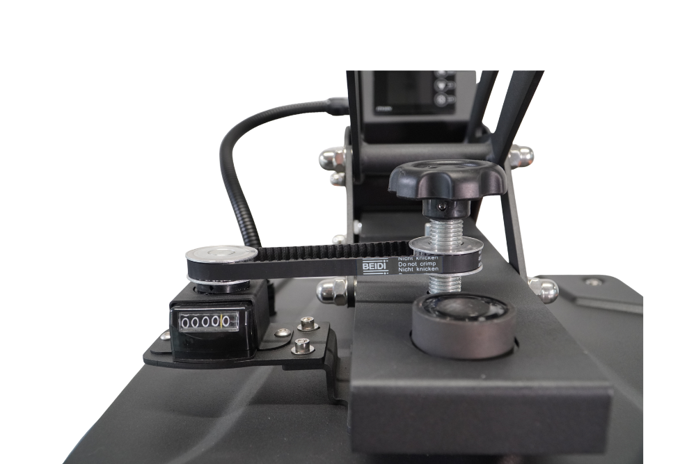 Die über einen Riemen mit der Presse verbundene Druckanzeige, gibt dem Benutzer eine Skala, an der der gewünschte Anpressdruck abgelesen werden kann. Dieser ist in keinen Einheiten angegeben, sondern lediglich nummerisch auf bzw. absteigend. Dadurch kann man sich selbst seinen Sweetspot für jede Folie individuell suchen und aufschreiben.