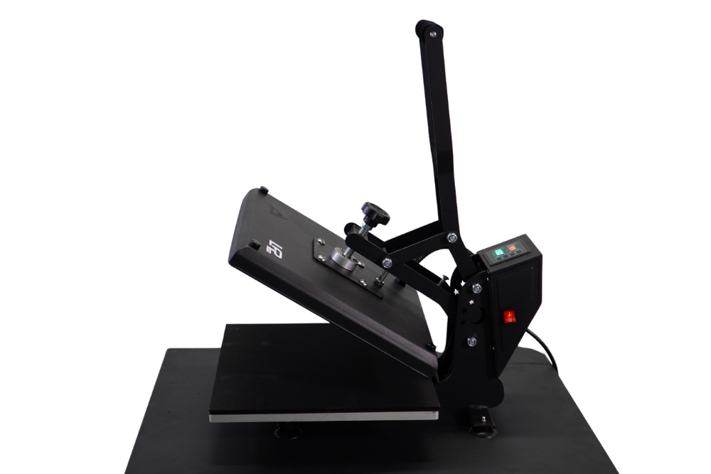 Der Druck der Transferpresse ist über einen Drehknauf manuell einzustellen. Die Presse öffnet nicht automatisch.